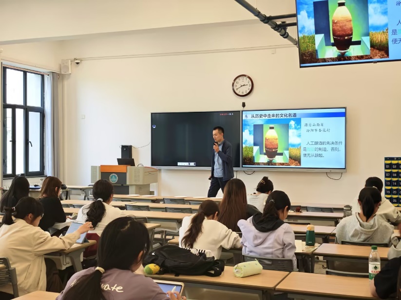 针对汾酒酿造核心工艺环节,孙老师通过实物演示与流程动画相结合的方式,对制曲、发酵、蒸馏、陈酿等关键工序的技术要点展开深度讲解。他着重强调,传统酿造工艺的传承发展离不开现代科技赋能,勉励同学们既要扎实掌握微生物学、发酵工程等专业理论基础,也要主动投身实验室小试与生产车间中试实践,以“理论-实践-创新”的闭环学习模式,系统掌握白酒酿造核心技艺,努力成长为兼具传统工艺素养与现代创新能力的复合型专业人才,为我国白酒产业的科技创新与高质量可持续发展贡献青春与智慧。